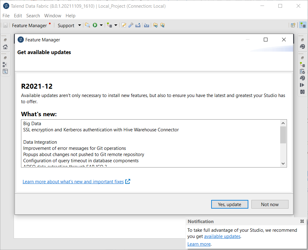 Après avoir configuré les référentiels de mise à jour pour le Studio Talend et dans le Studio Talend correctement, le Studio Talend détecte, obtient et installe automatiquement les mises à jour. Pour plus d'informations concernant les référentiels de mise à jour, consultez Configurer les référentiels de mises à jour pour le Studio Talend et l'intégration continue et Configuration des référentiels de mise à jour. Pour plus d'informations concernant la mise à jour du Studio Talend, consultez Mettre à jour le Studio Talend.
