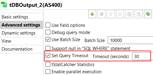Une nouvelle option, Set Query Timeout (Configurer le délai avant expiration de la requête) (avec le champ Timeout (Délai avant expiration)), est fournie, vous permettant de configurer la période de délai avant expiration de la requête. Le Job est arrêté si le délai avant expiration de la requête expire. Cette option est disponible dans les composants suivants.