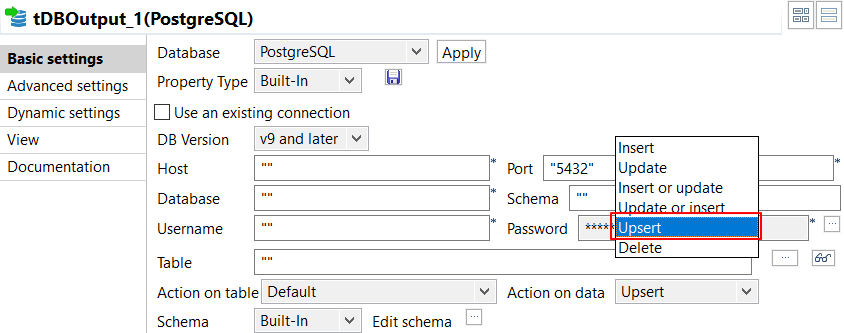 Le tPostgresqlOutput fournit l'option Upsert dans la liste déroulante Action on data (Action sur les données). Cette option insère un enregistrement ou une mise à jour d'un enregistrement existant à l'aide de l'instruction PostgreSQL INSERT-ON CONFLICT. Les opérations d'insertion et de mise à jour sont intégrées dans une seule instruction et fournissent de bien meilleures performances par rapport aux options Insert or update et Update or insert. Selon un test comparatif entre l'opération Upsert et l'opération Insert or update, la bande passante de l'opération d'Upsert en mode batch (par lots) est 10 à 100 fois supérieure (elle varie avec la taille de la table et le nombre de modifications).