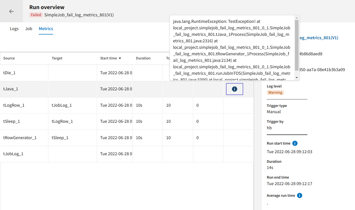 Vous pouvez voir la description de l'erreur, si une erreur survient dans un composant, durant l'exécution du Job. Vous pouvez copier cette description d'erreur pour en comprendre les raisons ultérieurement.