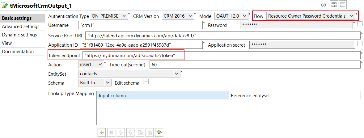 Les composants tMicrosoftCrmInput et tMicrosoftCrmOutput supportent le flux d'authentification Resource Owner Password Credentials (ROPC) (Identifiant et mot de passe du détenteur de la ressource) pour récupérer le jeton d'authentification lorsque le type d'authentification est ON_PREMISE et que la version du CRM est CRM 2016. Pour utiliser le flux d'authentification ROPC, sélectionnez Resource Owner Password Credentials (Identifiant et mot de passe du détenteur de la ressource) dans la liste déroulante Flow (Flux), configurez l'endpoint du jeton dans le champ Token endpoint (Endpoint du jeton) et saisissez l'URL de la ressource OAuth dans le champ Resource (Ressource) (facultatif).