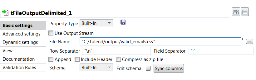 Double-cliquez sur le tFileOutputDelimited afin d'ouvrir sa vue Basic settings et définir les propriétés du composant.