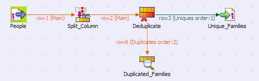 Dans ce scénario, vous utilisez un Job similaire à celui décrit dans le scénario précédent pour dédoublonner les données d'entrée de plusieurs familles, de telle manière qu'une seule personne par famille reste sur la liste des noms. Comme tous les composants de ce Job supportent le schéma dynamique, vous pouvez utiliser cette option pour gagner du temps en évitant de configurer chaque colonne des schémas.