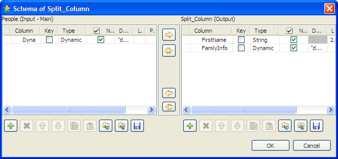 - Dans le panneau Output, sur la droite, cliquez sur le bouton [+] pour ajouter deux colonnes dans le schéma de sortie et appelez-les respectivement FirstName et FamilyInfo.