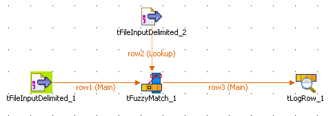Ce scénario décrit un Job constitué de quatre composants dont le but est de vérifier la distance d'édition comprise entre les colonnes First Name (prénom) d'un fichier d'entrée et de comparer les données avec celles du fichier de référence. Le résultat de cette vérification de la distance de Levenshtein et le contenu du flux principal sont affichés dans une table.