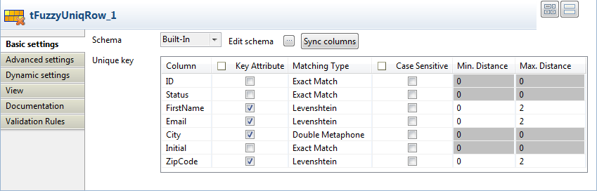 Dans cet exemple, Levenshtein est utilisé comme méthode de correspondance pour les colonnes FirstName, Email et ZipCode, le Double Metaphone sera utilisé comme méthode de correspondance pour la colonne City.