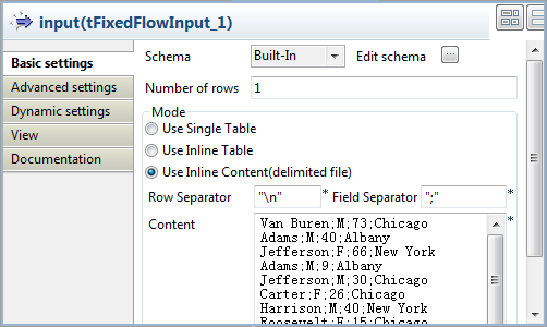 Sélectionnez l'option Use Inline Content(delimited file) dans la zone Mode et saisissez les données d'entrée dans le champ Content.