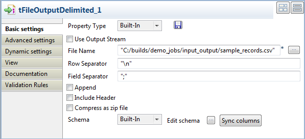Double-cliquez sur le tFileOutputDelimited afin d'ouvrir sa vue Basic settings et définir ses propriétés.