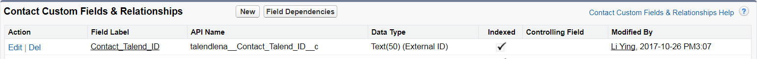 Un champ d'ID externe personnalisé Contact_Talend_ID a été ajouté pour l'objet Contact dans Salesforce, qui sera utilisé en tant que colonne clé pour l'upsert sur les données de l'objet Contact.