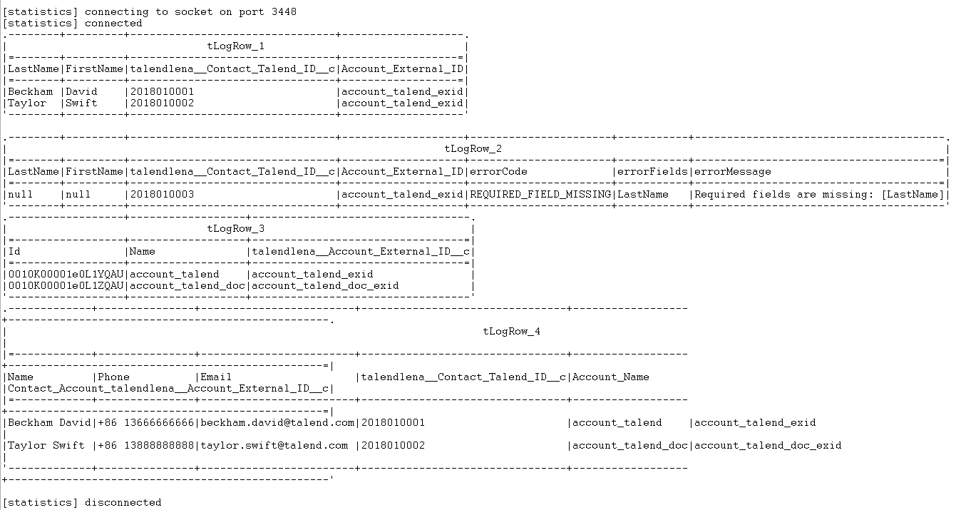 Comme affiché ci-dessus, les deux enregistrements Account account_talend et account_talend_doc ont bien été insérés. Deux enregistrements Contact Beckham David et Taylor Swift ont bien été insérés et mis à jour à partir de la relation de mapping avec les ID externes dans l'objet Account et un autre enregistrement Contact dans lequel manque la valeur du champ LastName requis n'a pas été inséré.