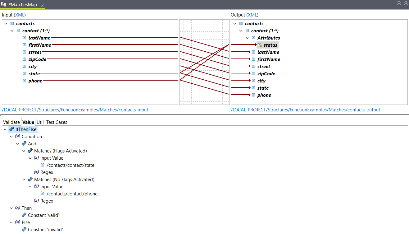 Dans cet exemple, un fichier XML contient des informations de contact. Vous souhaitez vérifier que les éléments state et phone correspondent à un modèle spécifique et indiquer si un contact est valide ou invalide, à l'aide d'un attribut. Vous pouvez utiliser l'échantillon XML suivant en entrée :
