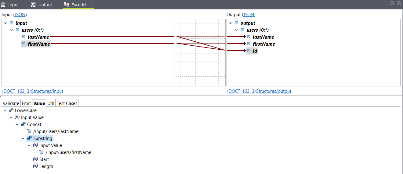 Dans cet exemple, un fichier JSON contient le nom et le prénom des utilisateur·trices. Vous souhaitez générer un ID utilisateur·trice, tout en minuscules, composé du nom de famille complet, ainsi que des deux premières lettres du prénom. Vous pouvez utiliser l'échantillon JSON suivant en entrée : Vous pouvez utiliser l'échantillon JSON suivant pour créer votre structure de sortie :