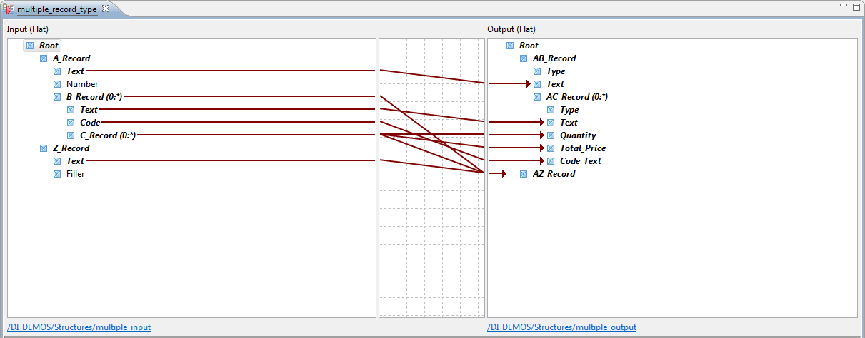 L'exemple suivant explique comment créer une map qui écrit à partir d'un fichier plat à enregistrements multiples vers un autre fichier plat à enregistrements multiples. Il explique comment paramétrer manuellement les structures et utilise des fonctionnalités comme le terminateur et l'initiateur dans le mapping.