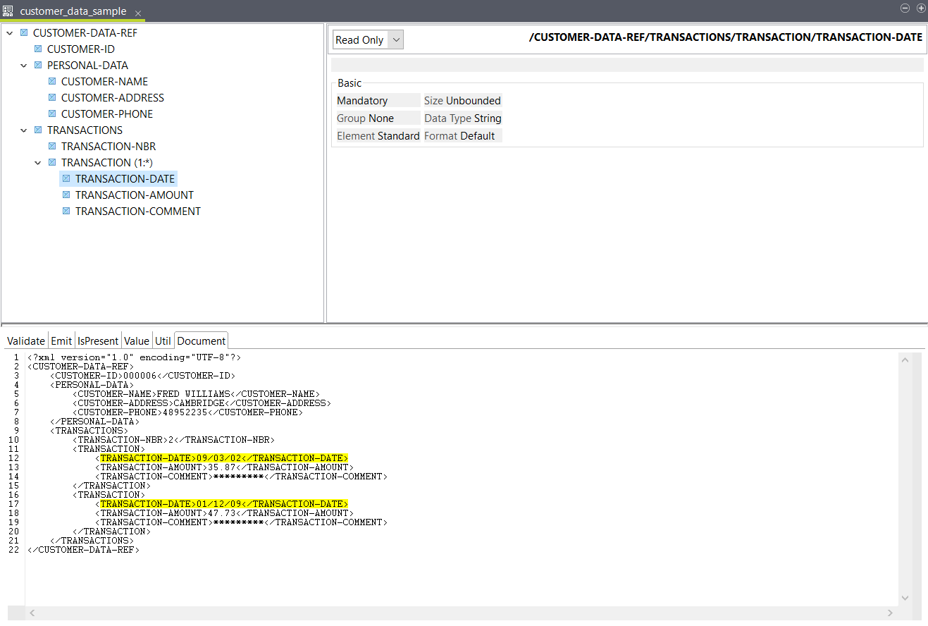 Votre structure est créée et s'ouvre dans l'éditeur. Le fichier importé est configuré comme document échantillon. Lorsque vous sélectionnez un élément dans la structure, il est mis en valeur dans l'onglet Document.