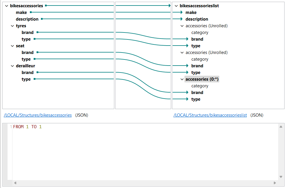 Cela crée deux éléments non répétables identiques. Ils sont nécessaires pour mapper les éléments d'entrée tyres, seat et derailleur à la même boucle de sortie accessories. Même si la structure de la map affiche trois éléments accessories différents après avoir déroulé les éléments, la sortie contiendra un seul tableau accessories avec le contenu des trois éléments.