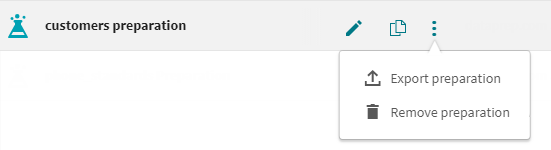 Export preparation (Exporter la préparation) | Utilisez ce bouton pour exporter au format json une préparation que vous souhaitez promouvoir vers un autre environnement. |