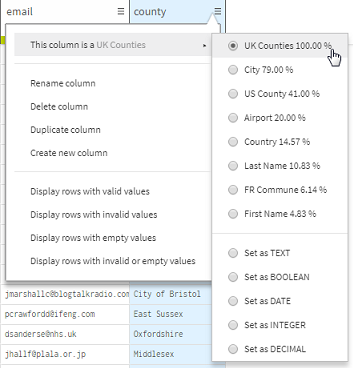 Imaginez que vous travaillez pour une entreprise anglaise, dont les clients résident uniquement au Royaume-Uni. Dans cet exemple, vous devez nettoyer des données clients, comme les noms, adresses e-mail, ou le pays de résidence. Les types sémantiques pour la colonne contenant les données des comtés seront configurés par défaut à city. Certaines des données peuvent correspondre à des noms de villes, mais vous souhaitez ajouter un type sémantique plus spécifique à vos données : le type sémantique UK_counties dans cet exemple.