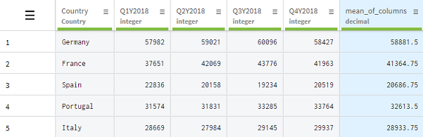 Cet exemple utilise un jeu de données listant le nombre de ventes pour un produit spécifique, par pays et par trimestre. En une action, vous pouvez calculer une moyenne des ventes trimestrielles pour chaque pays.