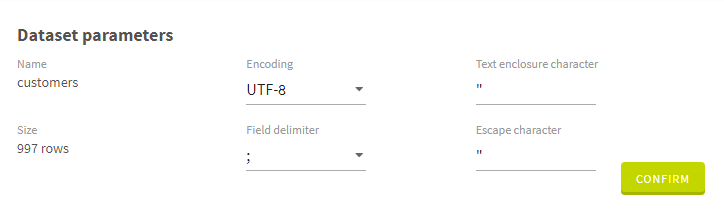 Lorsque vous ajoutez un jeu de données depuis un fichier .csv local, vous avez la possibilité de configurer les caractères d'échappement et d'entourage du texte, ainsi que le séparateur.