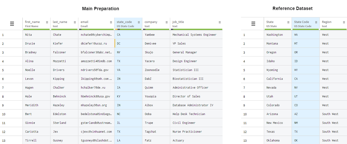 5. Dans votre préparation et votre jeu de données de référence, cliquez sur la colonne contenant les codes d'États afin de les mettre en évidence.