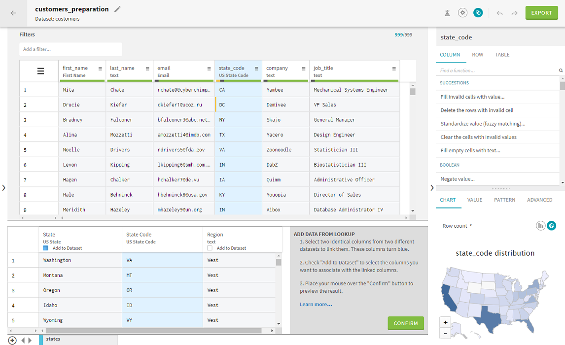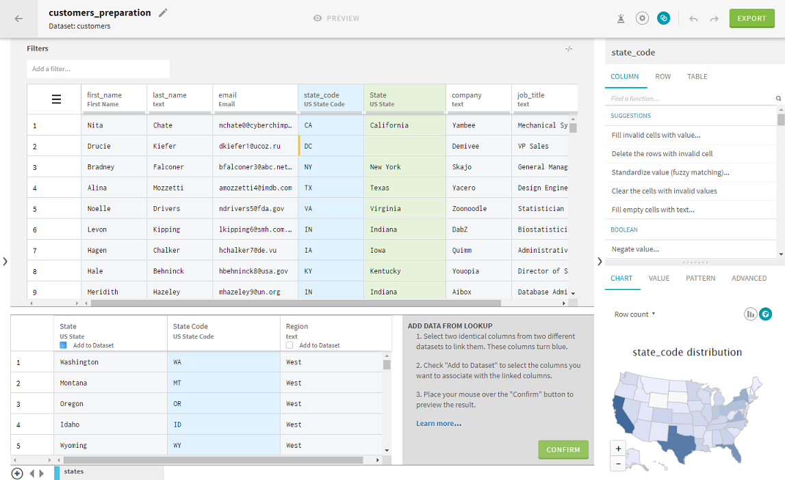 1. Sélectionnez la colonne commune à votre préparation principale et à votre jeu de données de référence, state_code dans cet exemple.