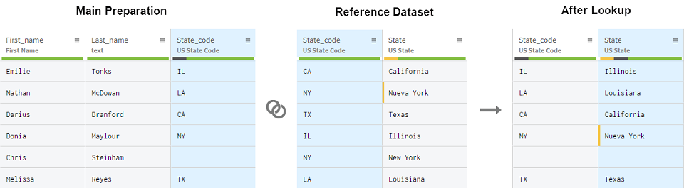 Imaginez que l'un des codes d'États manque dans votre préparation et que votre jeu de données de référence contient une entrée en doublon pour le code d'État NY. Par exemple, NY a deux valeurs possibles, New York et Nueva York, mais elle peut être la même pour les deux entrées.