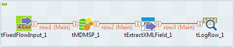 Dans ce scénario, le Job génère d'abord des paramètres et les envoie au tMDMSP, qui exécute une procédure stockée prédéfinie, puis extrait les données du résultat d'exécution retourné et les affiche dans la console.