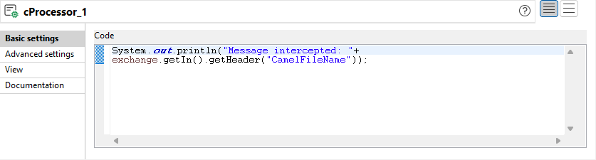 Personnalisez le code dans la zone Code pour afficher l'en-tête CamelFileName du message intercepté dans la console :