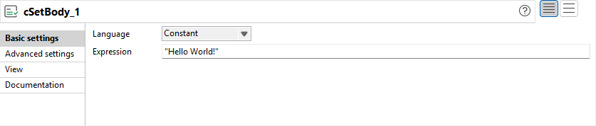 Double-cliquez sur le premier composant cSetBody pour afficher sa vue Basic settings dans l'onglet Component.