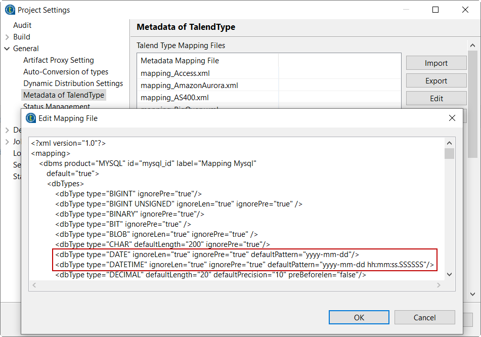 | amélioration des mapping de type Talend | Vous pouvez maintenant configurer un modèle par défaut pour chaque type de données dans le fichier de mapping de type Talend. Cela permet aux modèles de date pour les colonnes de type date d'être automatiquement configurés lors de la récupération ou détection du schéma d'une table.