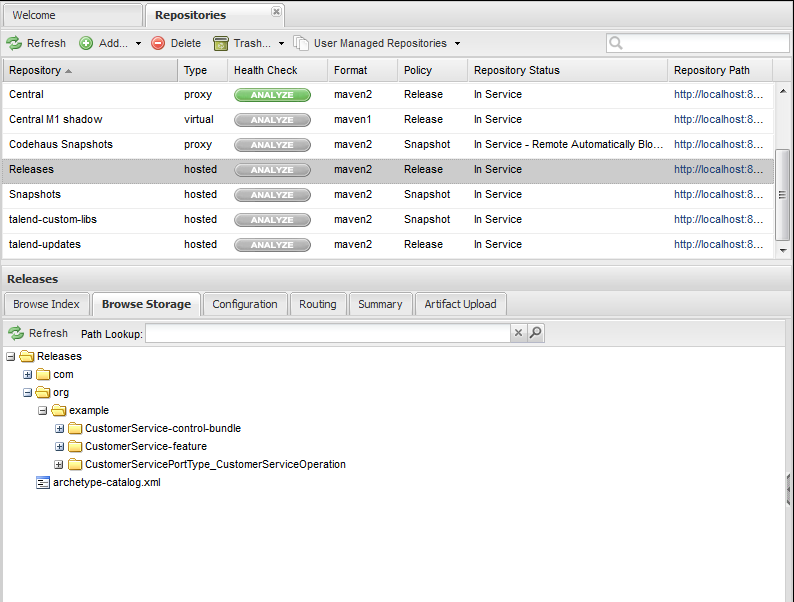 Une fois publié, le Service s'affiche dans l'Référentiel d'artefacts Talend (Talend Artifact Repository), sous le nœud org/example. Cliquez sur le bouton Open Artifact repository en haut de la page Publisher pour ouvrir l'application Web de Nexus. Cela ouvre l'application Web Nexus. Dans Repositories > Snapshots, vous pouvez retrouvez l'artefact de votre Service :
