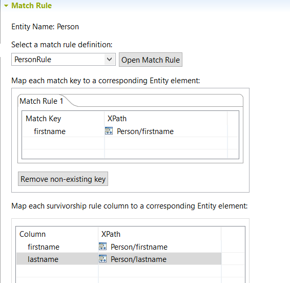 Si vous souhaitez attacher une règle de rapprochement à règles multiples à un modèle de données, assurez-vous que chaque clé de rapprochement est correctement mappée vers un élément d'entité dans chaque règle de la règle de rapprochement.