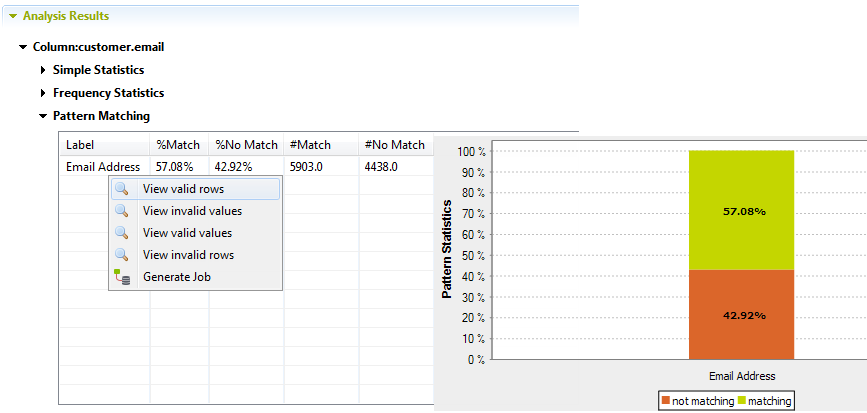 Lorsque vous utilisez le moteur Java, la vue s'ouvre dans la perspective Profiling et liste le nombre de données valides/invalides selon la limite définie dans la vue Analysis parameters de l'éditeur d'analyse. Pour plus d'informations, consultez Utiliser le moteur Java ou SQL.