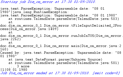 L'option Die on error empêche le traitement des erreurs. Pour ce faire, elle arrête l'exécution du Job aussitôt qu'une erreur est rencontrée. Le composant tMap fournit cette option afin d'empêcher le traitement des données erronées. L'option Die on error est activée par défaut dans le tMap.