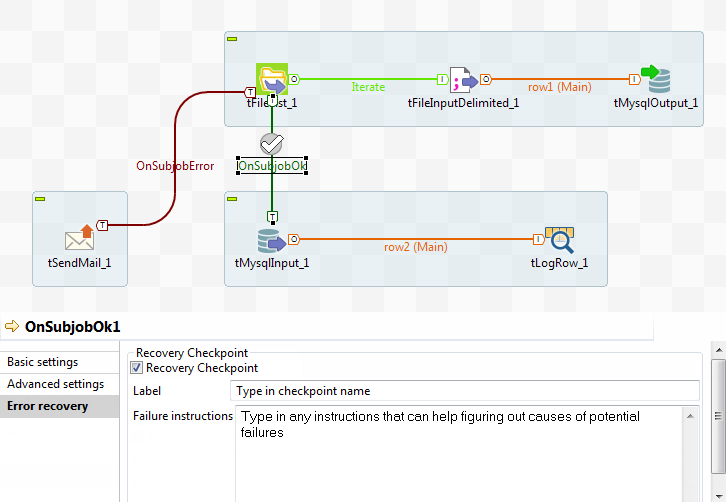 Les deux catégories de connexions de déclenchement (Trigger) OnSubjobOK et OnSubjobError comportent une option supplémentaire permettant de définir des "points de validation" sur une ou plusieurs connexions de déclenchement utilisées pour la conception du Job. En cas d'échec durant l'exécution du Job, vous pourrez ainsi la reprendre à partir du dernier point de validation précédent l'erreur.