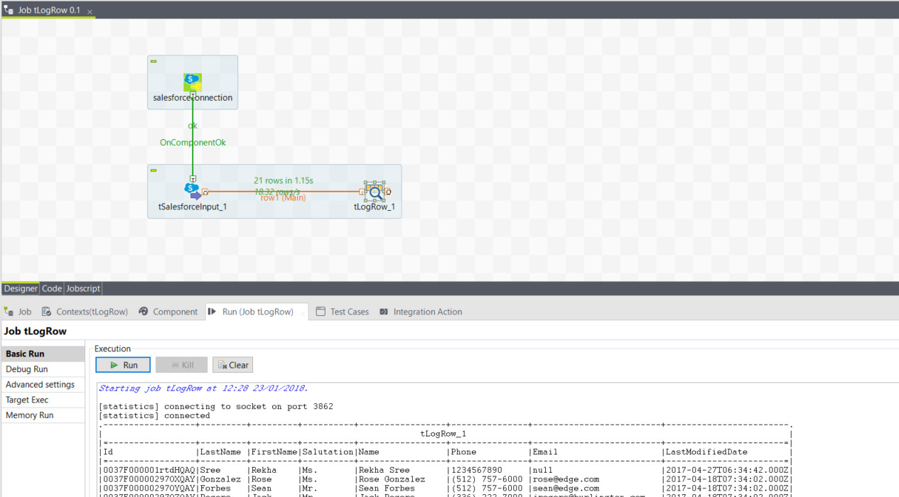 Le Job d'exemple présente une conception dans laquelle le tLogRow est utilisé pour afficher les enregistrements traités dans la console.