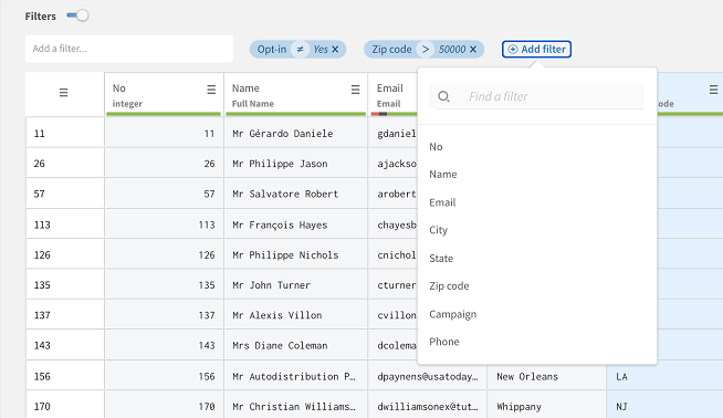 プレパレーションでの作業時のフィルタリング機能が改善されました。グローバル検索に加え、[Add filter] (フィルターを追加)ボタンを使えば、カラム、演算子、検索するキーワードを具体的に選択できます。これによって、フィルターの作成と組み合わせがより直感的かつ強力になりました。