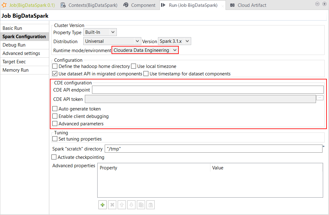 Spark 3.1.xでSpark Universalを使い、Cloudera Data EngineerエクスペリエンスでSparkジョブを実行できるようになりました。これはSparkジョブの[Spark Configuration] (Spark設定)ビューで設定できます。 情報メモ重要: ベータ版機能であるため、本番環境での使用には適していません。