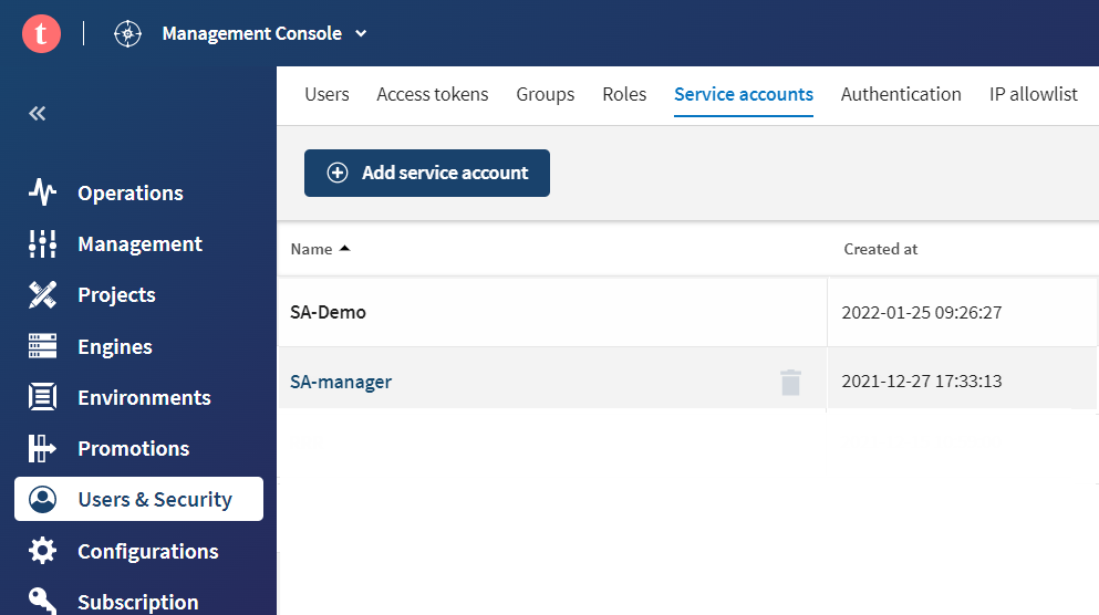 新しいサービスアカウントタブを使って、サービスアカウントを簡単に作成や管理できます。サービスアカウント特有のアクセストークンは、パーソナルアクセストークンとともに[Access tokens] (アクセストークン)タブで表示や管理されます。 サービスアカウントが作成された後は、他のTalend Management Console APIサービスと併用して日常のタスクを完了させます。サービスアカウントAPIエンドポイントが提供するさらに高度な機能によって、この新しいサービスアカウント機能を活用できるようになります。 サービスアカウントAPI機能の詳細については、次のAPI特有のセクションをご覧ください。 サービスアカウントトークンはパーソナルアクセストークンではありません。標準的なOAuth2クライアント認証情報のフローをベースにしていて、専用のAPIサービスエンドポイントを介して生成される必要があります。 |