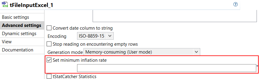 Excel 2007ファイル用にtFileInputExcelコンポーネントに[Set minimum inflation rate] (最小膨張率を設定)オプションが追加されました。これにより、圧縮バイトと膨張バイトの比率を設定して高圧縮ファイル爆弾を検出できるようになりました。