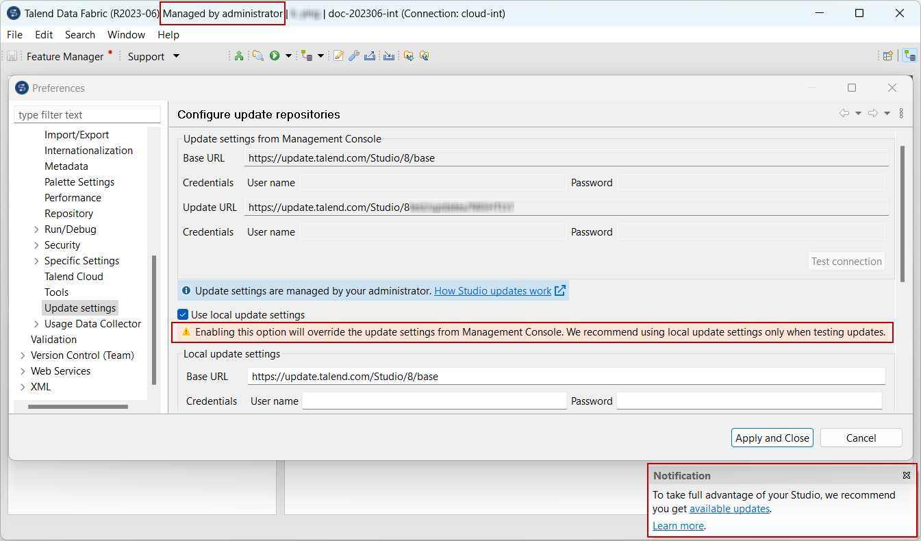 [Use local update settings] (ローカルアップデート設定を使用)オプションを有効にすると、Talend Studioの[Preferences] (環境設定)ダイアログボックスの[Update settings] (アップデート設定)ビューにも警告が表示されます。ローカルのアップデート設定はテスト目的でのみ使用することをお勧めします。 詳細は、アップデートリポジトリーを設定をご覧ください。