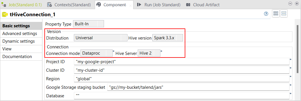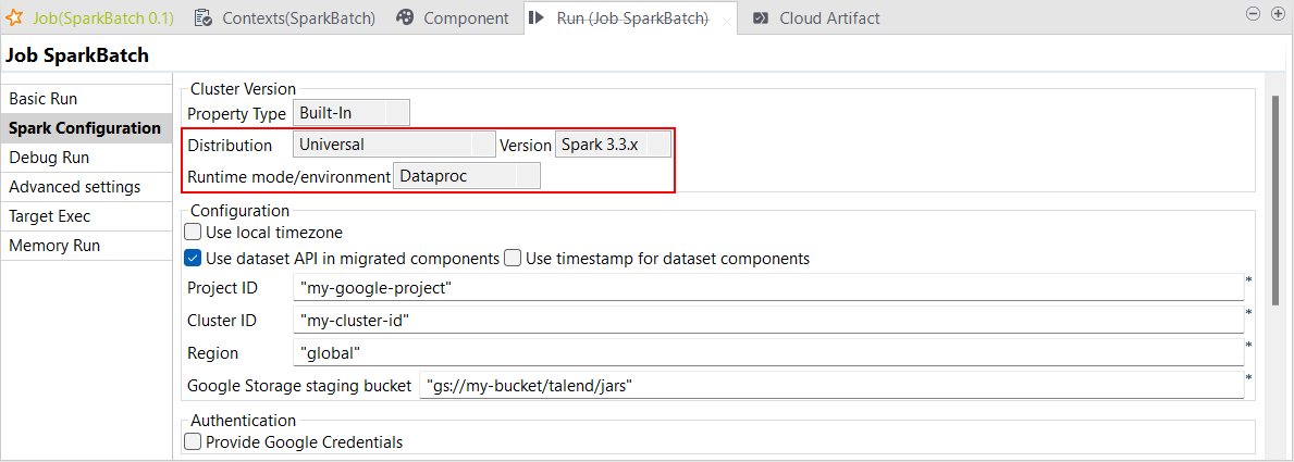 | Spark BatchジョブでのSpark Universal 3.3.xでDataproc 2.1以降をサポート | Spark Universal 3.3.xを使ったDataprocでSpark Batchジョブを実行できるようになりました。これはSpark Batchジョブの[Spark Configuration] (Spark設定)ビューで設定できます。 このモードを選択すると、Talend StudioはDataproc 2.1以降のバージョンと互換性を持つようになります。