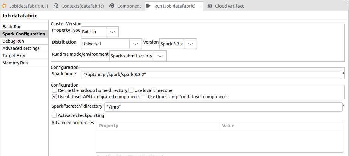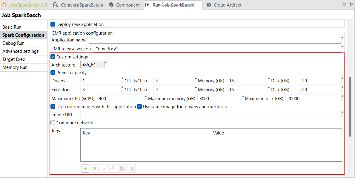 | Spark BatchジョブでSpark Universal 3.2.xと3.3.xを使ったAWS EMR Serverlessでのカスタム設定をサポート | Spark Universal 3.2.xと3.3.xを使ったAWS EMR Serverlessで、Spark Batchジョブの設定をカスタマイズできるようになりました。Spark Batchジョブの[Spark Configuration] (Spark設定)ビューで[Custom settings] (カスタム設定)チェックボックスを選択すればこの操作を実行できます。 この新しいパラメーターによって、すべての設定(事前初期化済みの要領やネットワーク接続など)を制御できます。