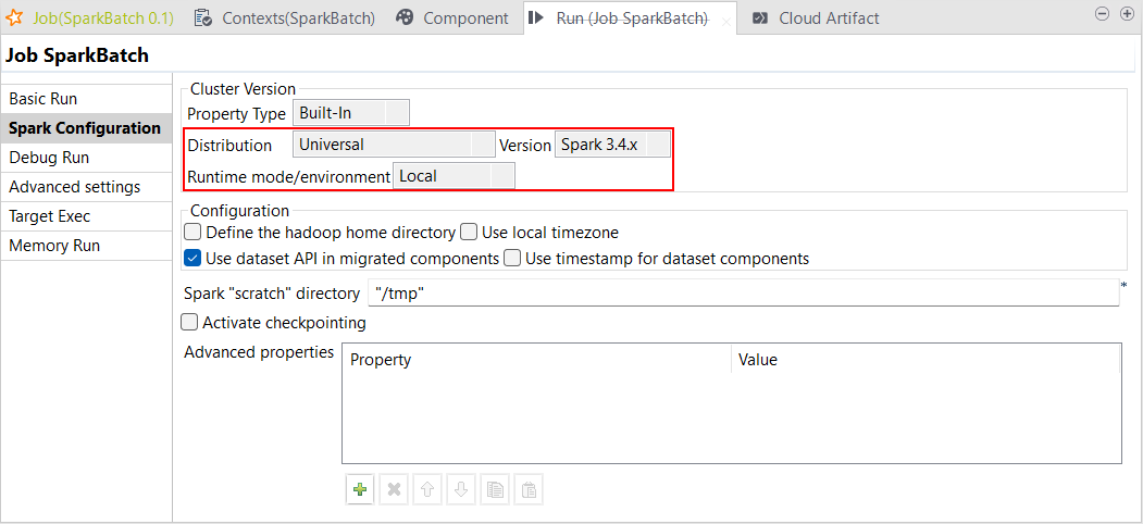 | ローカルモードでSpark Universal 3.4.xをサポート | [Local] (ローカル)モードのSpark 3.4.xで、Spark Universalを使ってSpark BatchジョブとSpark Streamingジョブを実行できるようになりました。Sparkジョブの[Spark configuration] (Spark設定)ビューまたは[Hadoop Cluster Connection] (Hadoopクラスター接続)メタデータウィザードのどちらかで設定できます。