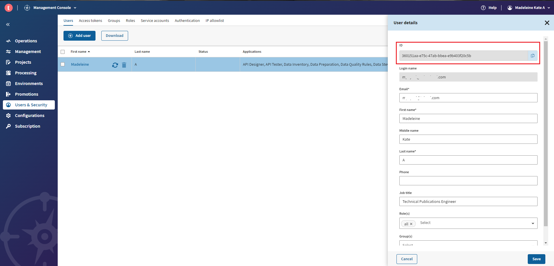 | プロジェクトID、ワークスペースID、ユーザーID、グループID: 改善点 | API経由でプロジェクトやワークスペースの権限を管理するため、プロジェクト、ワークスペース、ユーザー、グループのIDを簡単に見つけられるようになりました。 次の操作が可能です。