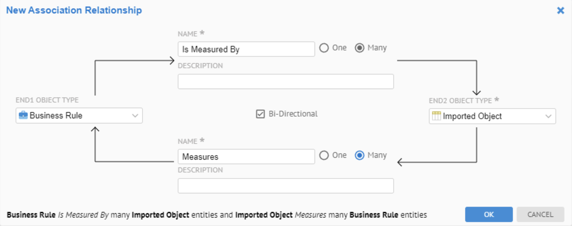 | 新しいメタモデルの管理 | 新しいメタモデル管理機能によって、データ管理(参照データ、データクオリティ、データセキュリティ、データ問題管理、ビジネスルールとポリシー、ビジネスプロセスのモデリングと改善、規制遵守など)のためのカスタムモデルを定義し、インポートモデルを拡張できます。 メタモデリング機能は[Manage Metamodel] (メタモデルを管理)ページで利用できます。