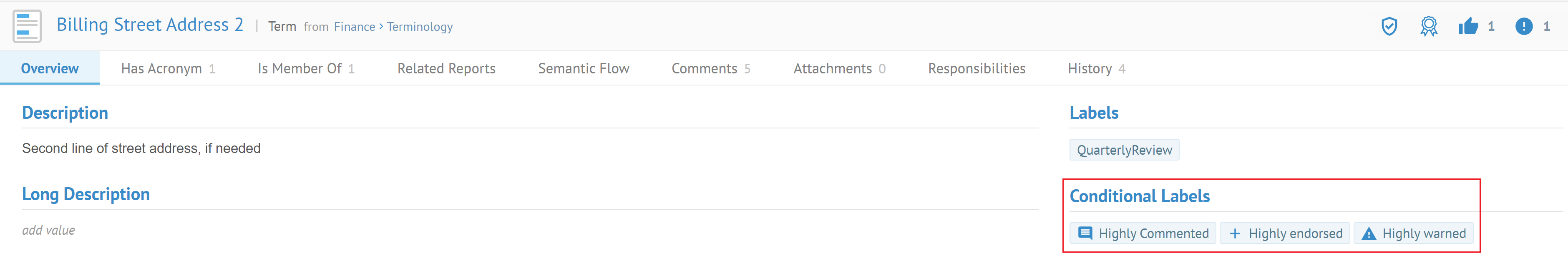 条件ラベルは、オブジェクト詳細ページの概要タブにある[Conditional Labels] (条件ラベル)エリアで確認できます。