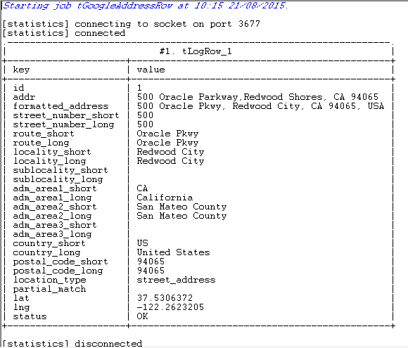 500 Oracle Parkway,Redwood Shores, CA 94065の詳細な地理情報は、Google Mapデータベースから取得され、コンソールに出力されます。
