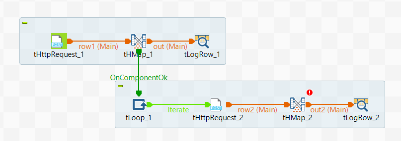 3. [Row] (行) > [Iterate] (反復処理)接続を使ってtLooptHttpRequestとリンクして、[Row] (行) > [Main] (メイン)接続を使って他のコンポーネントをリンクします。