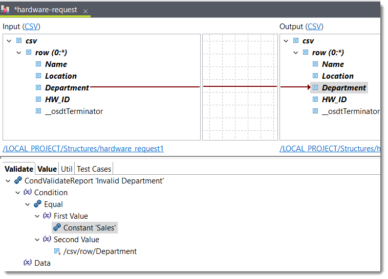 7. 出力テーブルからDepartment行を選択し、[Validate] (検証)タブを開きます。